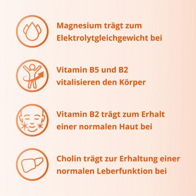 Vitamin B 2 and B 5 contribute to the reduction of tiredness and fatigue as well as to a normal energy-yielding metabolism. In addition, vitamin B 5 contributes to normal mental performance and vitamin B 2 contributes to maintaining normal skin and protecting cells from oxidative stress.