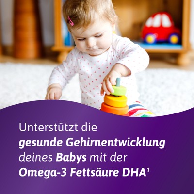DHA, short for docosahexaenoic acid, is an omega-3 polyunsaturated fatty acid. It contributes to the normal brain and eye development of the breastfed infant. Femibion ® 3 lactation contains 200 mg DHA. DHA intake from breast milk remains important during breastfeeding.