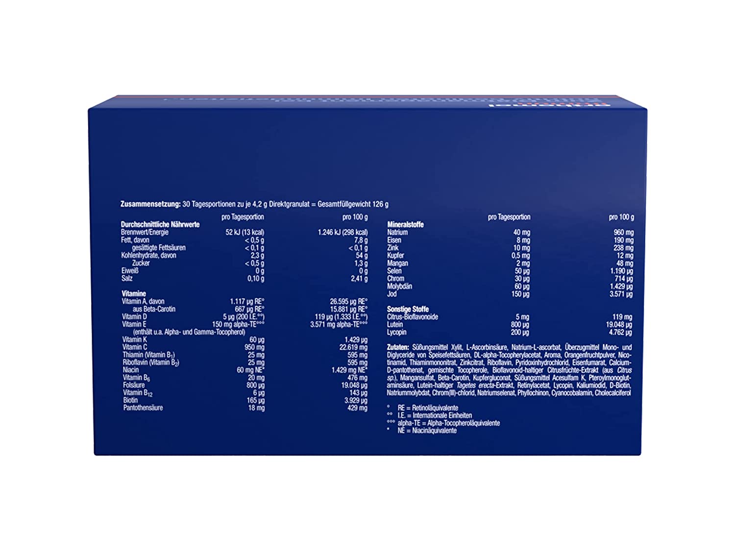 Orthomol Immun Direct Granules Orange is a dietary supplements . It contains important Micronutrients for the immune system such as B. Vitamin A, folic acid, vitamin B6, vitamin B12, vitamin C, vitamin D, selenium, iron, copper and zinc.* The direct granulate is without taking water and is therefore ideal for at home and on the go, for example when travelling.