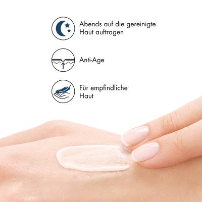 - • The cooling formula of the night cream for mature skin is enriched with Proxylane, cassia extract and hyaluronic acid. It reduces the visible signs of menopause on the skin, counteracts loss of firmness and ensures smoother skin.