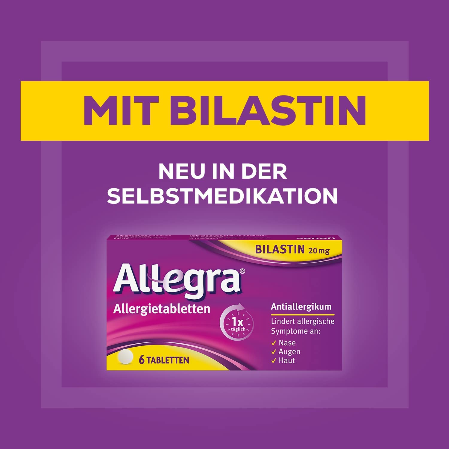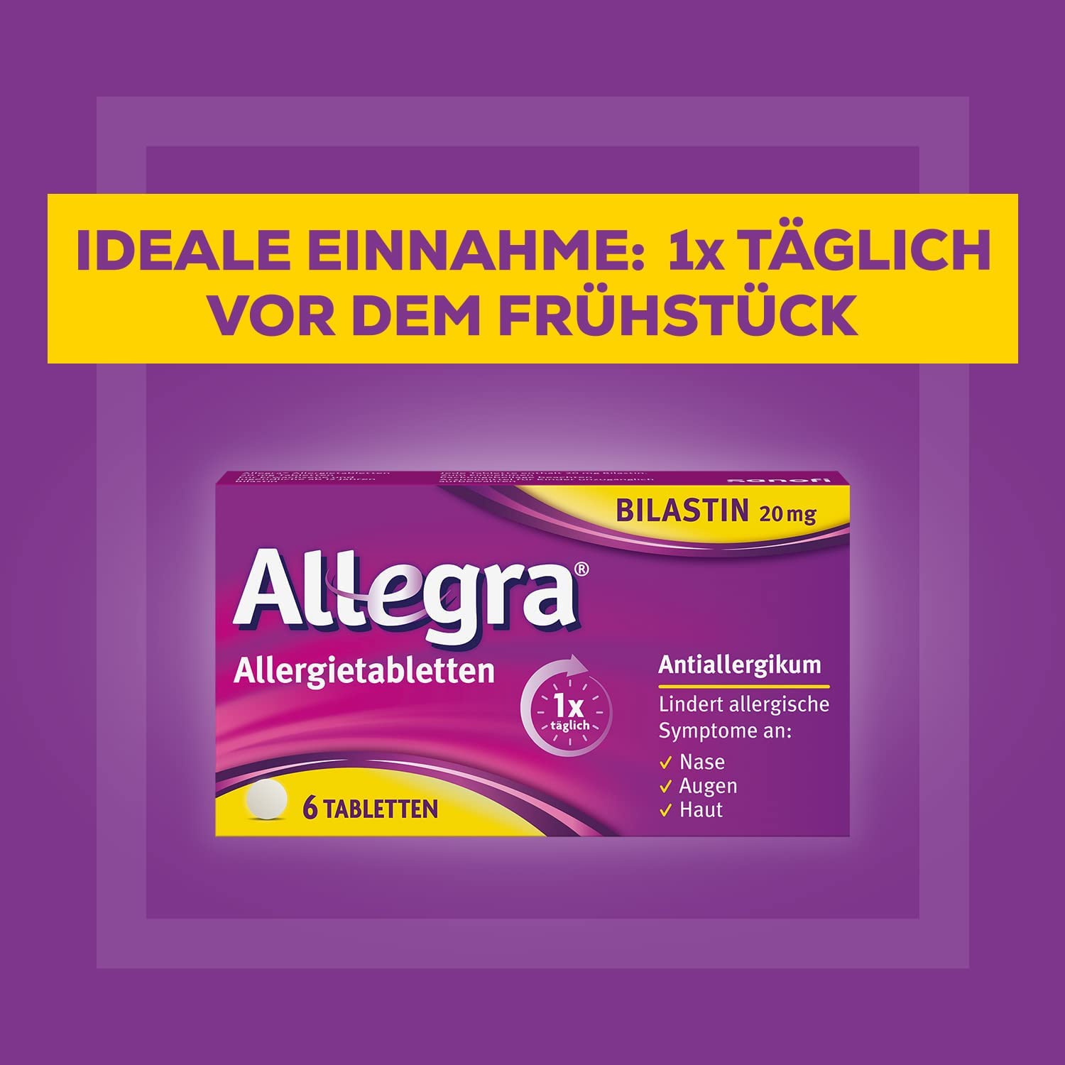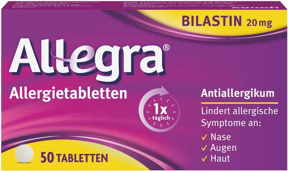 Allegra® Allergietabletten mit dem Wirkstoff Bilastin gehören zu den neuesten Generationen von Antihistaminika. Sie sind wirksam bei der Linderung allergisch bedingter Symptome wie Niesen, tränenden Augen, Juckreiz, Rötung und Quaddelbildung. Allegra® kann bei verschiedenen Allergien angewendet werden, einschließlich Heuschnupfen, Hausstaubmilbenallergie, Tierhaarallergie, Schimmelpilzallergie und Urtikaria (Nesselsucht).