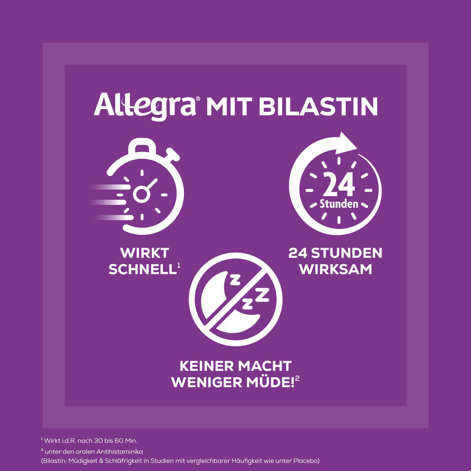 Was Allegra® von anderen Antihistaminika unterscheidet, ist die schnelle Wirkung. Es bietet eine schnelle Linderung innerhalb von 30-60 Minuten bei Symptomen an Nase, Augen und Haut. Bilastin, der Wirkstoff in Allegra®, beeinflusst nicht das Schlafzentrum, das für Müdigkeit verantwortlich ist. Daher macht Allegra® weniger müde als andere Antihistaminika. Eine klinische Studie hat gezeigt, dass Bilastin die Fahrtüchtigkeit und Konzentrationsfähigkeit nicht beeinträchtigt.