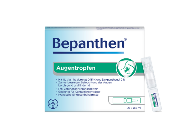 Personen, die an trockenen oder gereizten Augen leiden, können mit den Bepanthen® Augentropfen die Augenoberfläche befeuchten, den Tränenfilm stabilisieren und das Auge vor einem Trockenheitsgefühl schützen. Die Augentropfen von Bepanthen® sind frei von Konservierungsstoffen und Phosphaten. Der Wirkstoff Dexpanthenol und das enthaltene Natriumsalz der Hyaluronsäure können eine Linderung der Beschwerden bewirken. Die Bepanthen® Augentropfen sind als Ein-Dosis-Behältnis (praktisch für unterwegs) und in der Soft-Touch-Mehrdosisflasche (insbesondere zur regelmäßigen Anwendung) erhältlich. Träger und Trägerinnen von Kontaktlinsen können Bepanthen® Augentropfen gleichzeitig sowohl mit harten als auch mit weichen Kontaktlinsen anwenden.