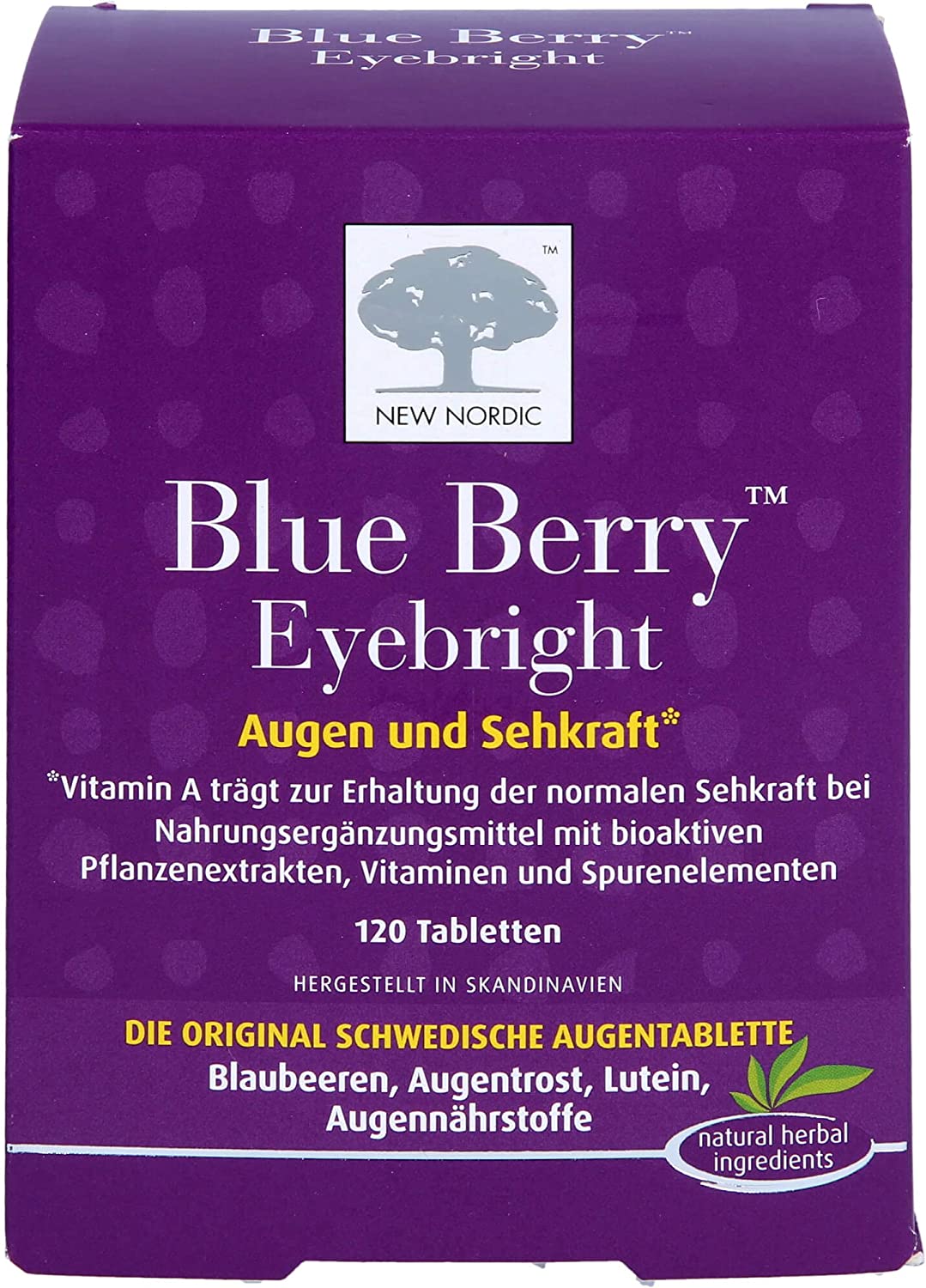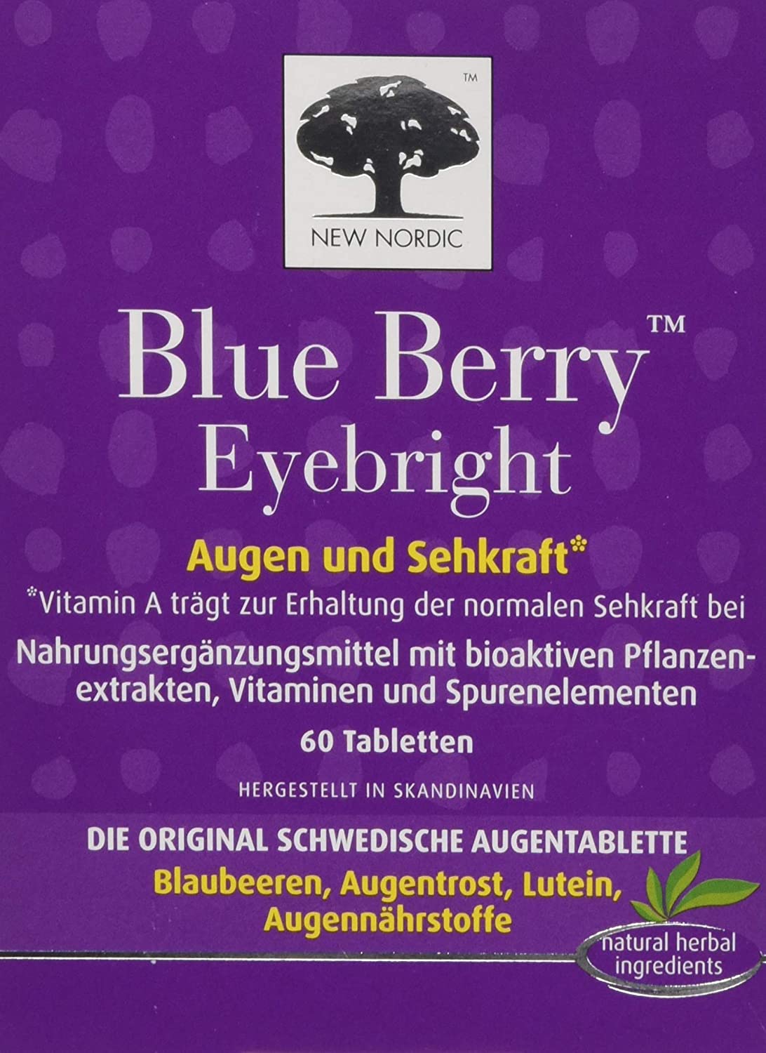 Bei Blue Berry handelt es sich um Tabletten von New Nordic Deutschland GmbH.Augen und Sehkraft. Blue Berry™ Eyebright ist eine original schwedische Blaubeertablette mit Extrakten von Blaubeeren, Augentrost und Studentenblumen. Der Studentenblumenextrakt hat einen standardisierten Gehalt an natürlichem gelben Pigment Lutein. Blaubeeren und Augentrost tragen zur Augengesundheit bei. Der Gehalt an Vitamin A trägt zur Erhaltung der normalen Sehkraft bei, der Gehalt an Zink - zur normalen kognitiven Funktion. Ideal für alle, auch Kontaktlinsenträger.