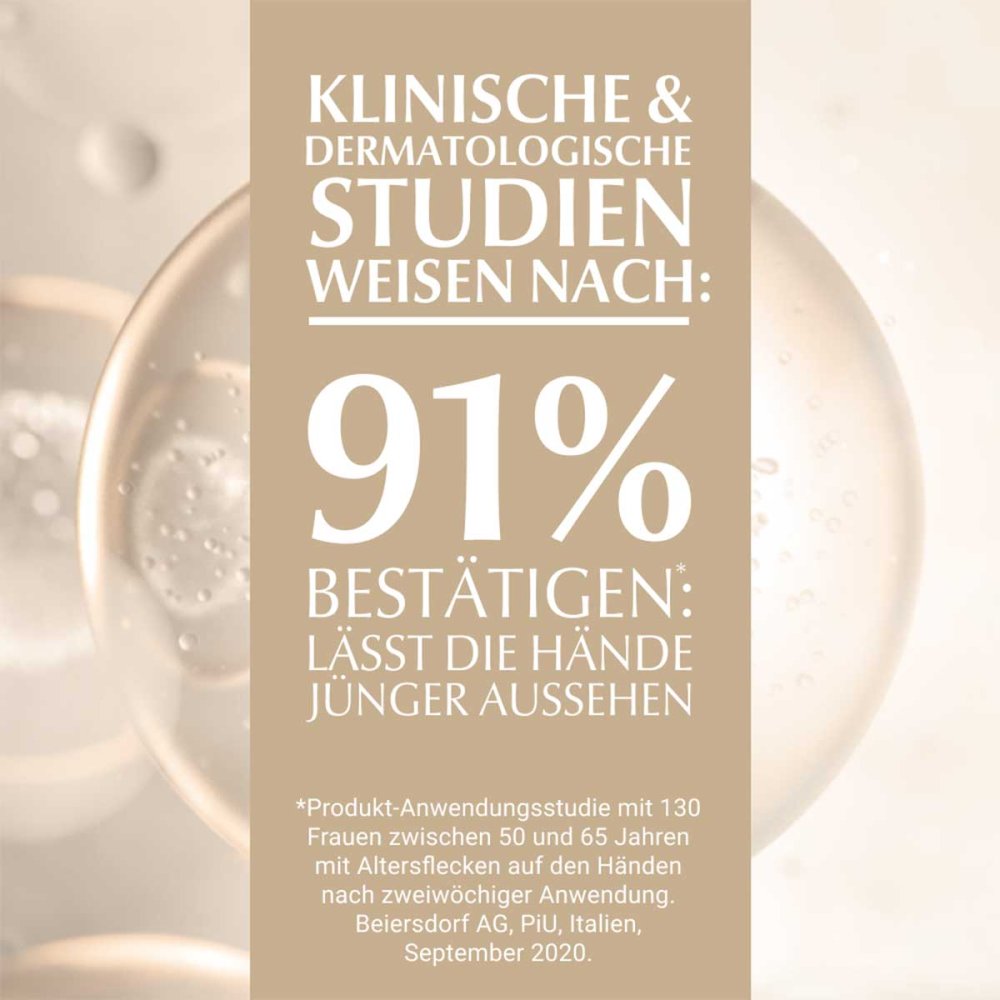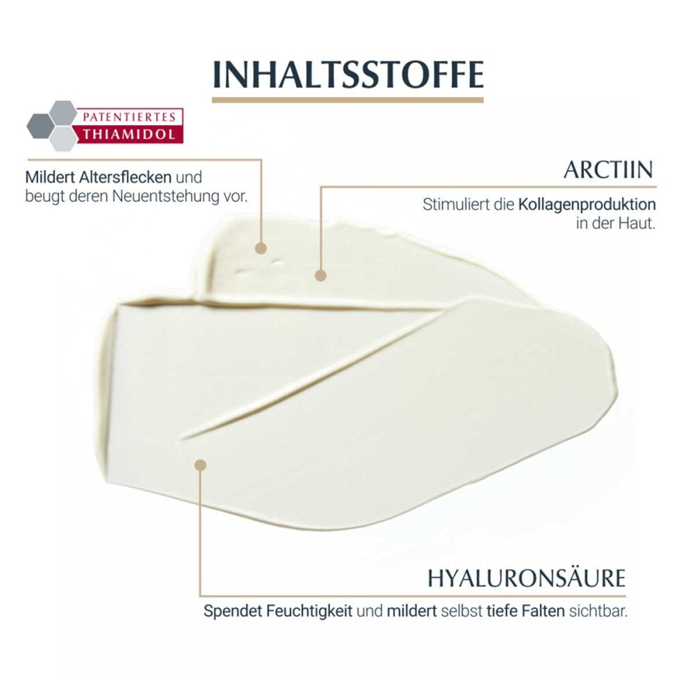 Sie enthält Thiamidol®, einen effektiven und patentierten Pflegewirkstoff, der an der Wurzel der Hyperpigmentierung wirkt, indem er die Melaninproduktion nachweislich hemmt. Klinische Studien belegen, dass Thiamidol® Altersflecken bei regelmäßiger Anwendung effektiv mildert und ihrer Neuenstehung vorbeugt. Erste Ergebnisse sind bereits nach zwei Wochen sichtbar und verbessern sich bei regelmäßiger Anwendung kontinuierlich.