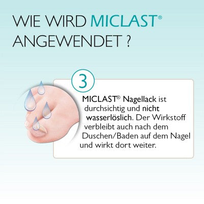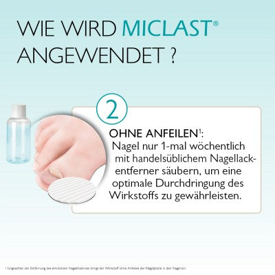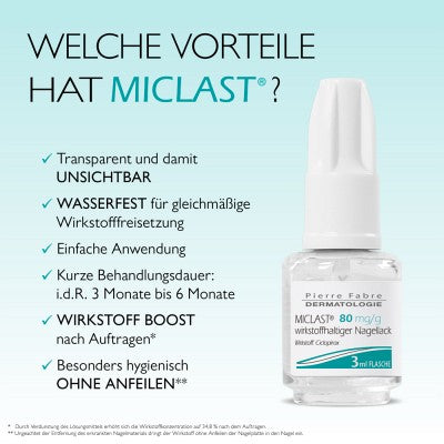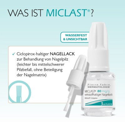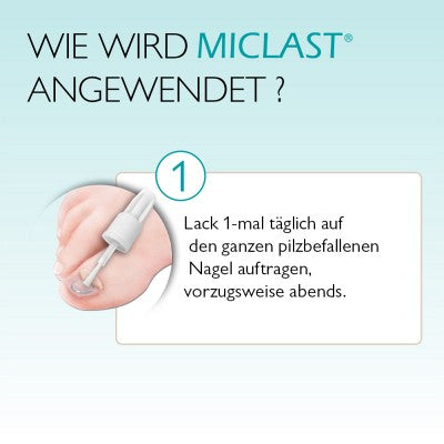 Miclast 80 mg/g ist ein Nagellack mit dem Wirkstoff Ciclopirox. Es wird zur Behandlung von leichtem bis mittelschwerem Nagelpilz-Befall (Onychomykose) der Finger- und Zehennägel eingesetzt. Der Wirkstoff Ciclopirox dringt in den Nagel ein und tötet die Pilze ab.
