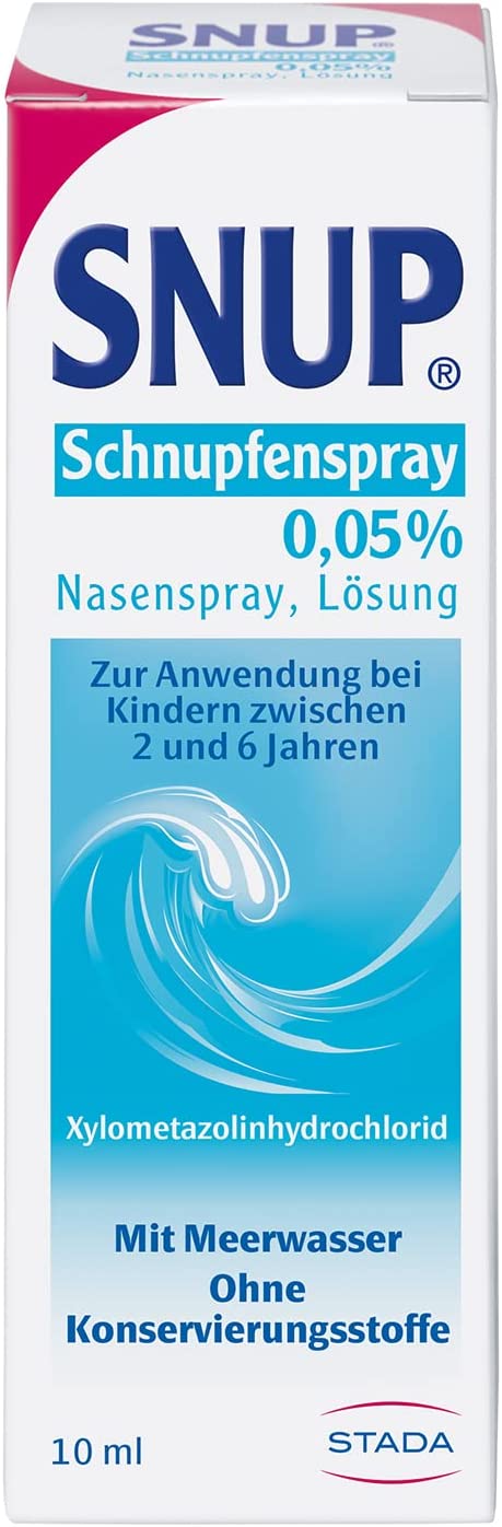 SNUP® Schnupfenspray 0,05 % Nasenspray, Lösung. Zur Anwendung bei Kindern zwischen 2 und 6 Jahren. Wirkstoff: Xylometazolinhydrochlorid. Zur Abschwellung der Nasenschleimhaut bei Schnupfen, anfallsweise auftretendem Fließschnupfen (Rhinitis vasomotorica), allergischem Schnupfen (Rhinitis allergica). Zur Erleichterung des Sekretabflusses bei Entzündung der Nasennebenhöhlen sowie bei Katarrh des Tubenmittelohrs in Verbindung mit Schnupfen. Zu Risiken und Nebenwirkungen lesen Sie die Packungsbeilage und fragen Sie Ihren Arzt oder Apotheker. STADA Consumer Health Deutschland GmbH, Stadastraße 2–18, 61118 Bad Vilbel. Stand: Juli 2020